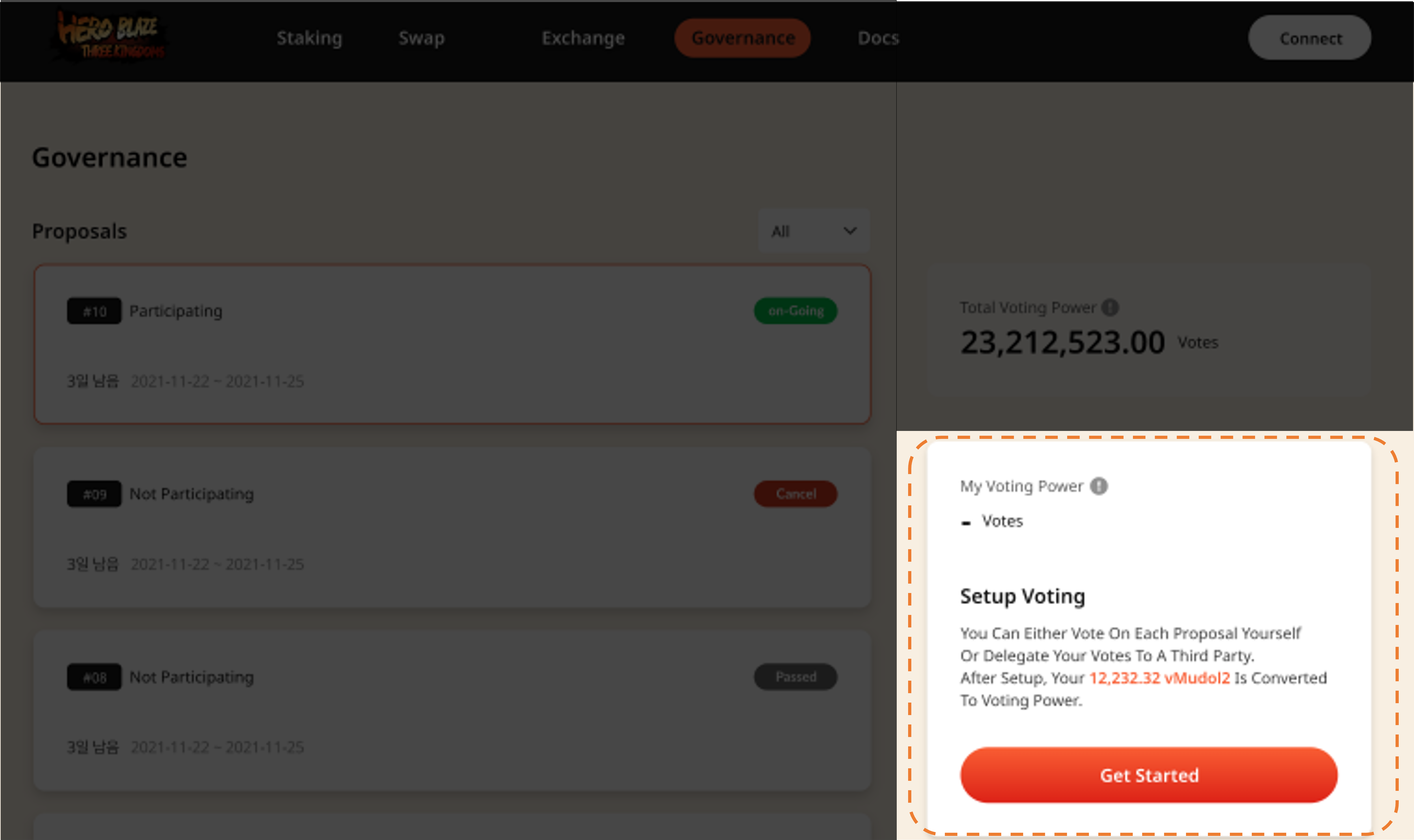 거버넌스 투표는 $MUDOL2를 스테이킹하여 획득할 수 있는 vMUDOL로 참여 가능합니다.